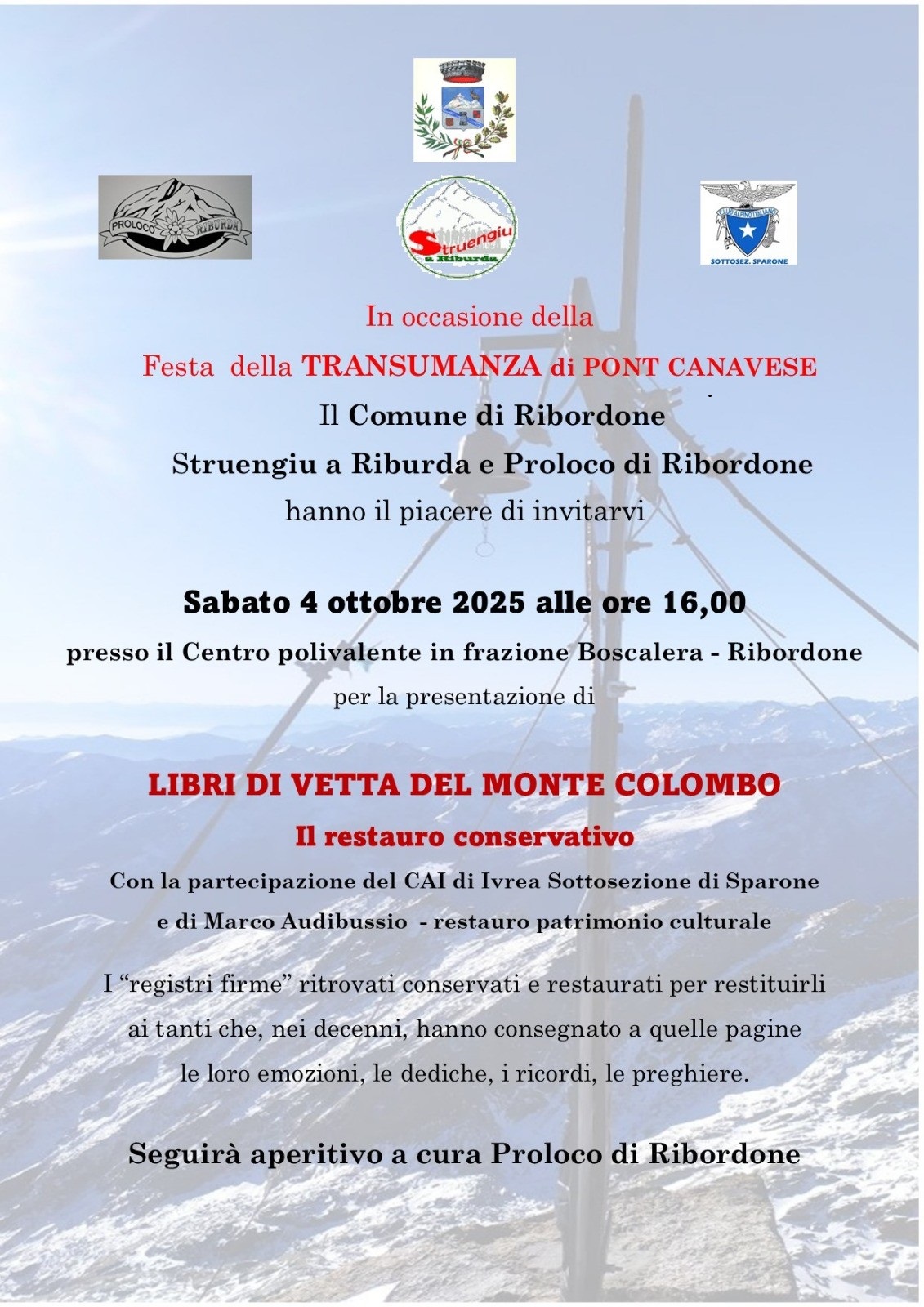 Durante l'incontro verrà presentato il restauro conservativo dei "Libri di vetta del Monte Colombo", con la partecipazione del CAI di Ivrea (Sottosezione di Sparone) e di Marco Audibussio, esperto di restauro del patrimonio culturale.